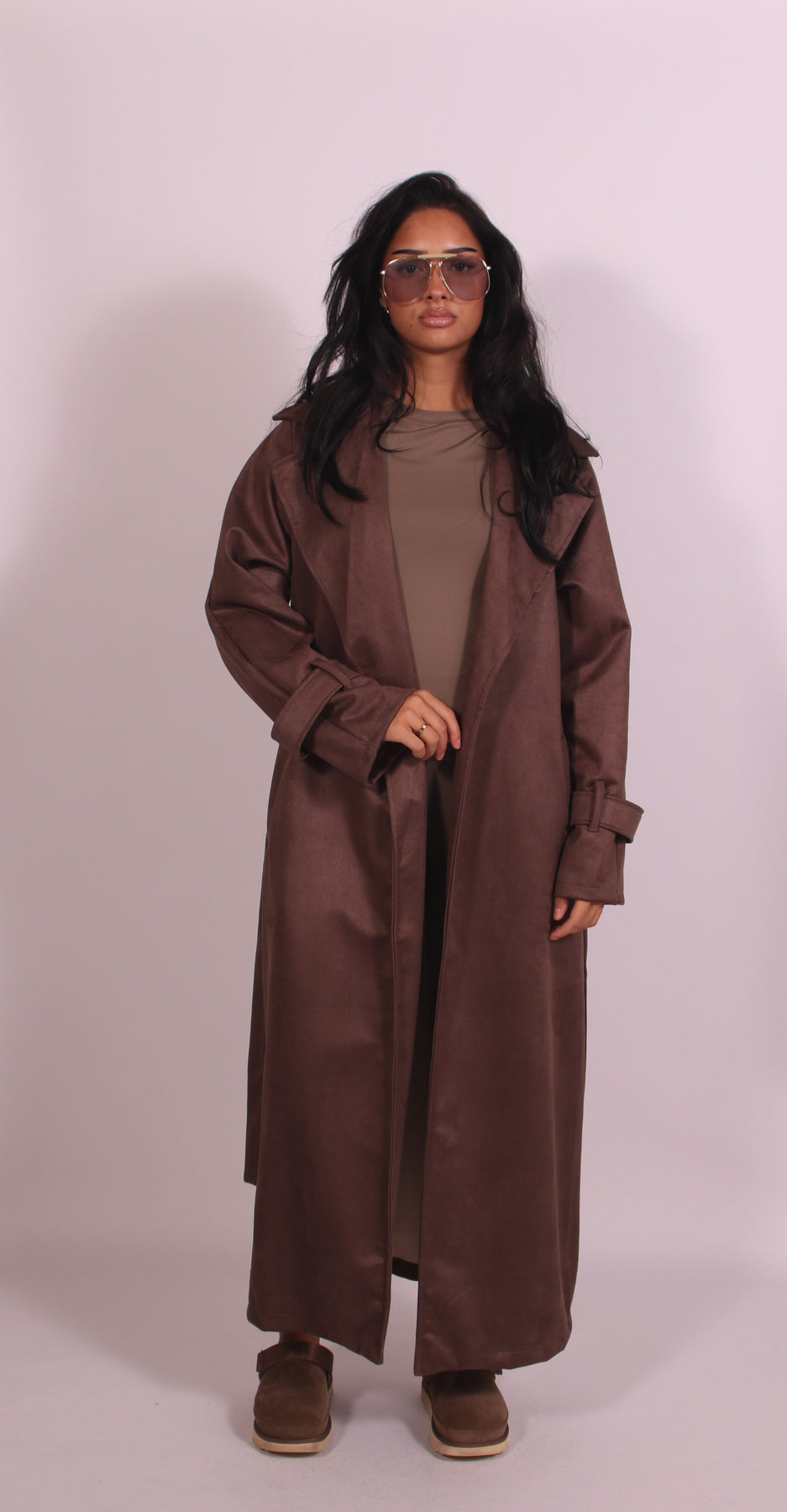 Het model is 1.65 lang en draagt maat de Suedine trenchcoat in maat One Size.
