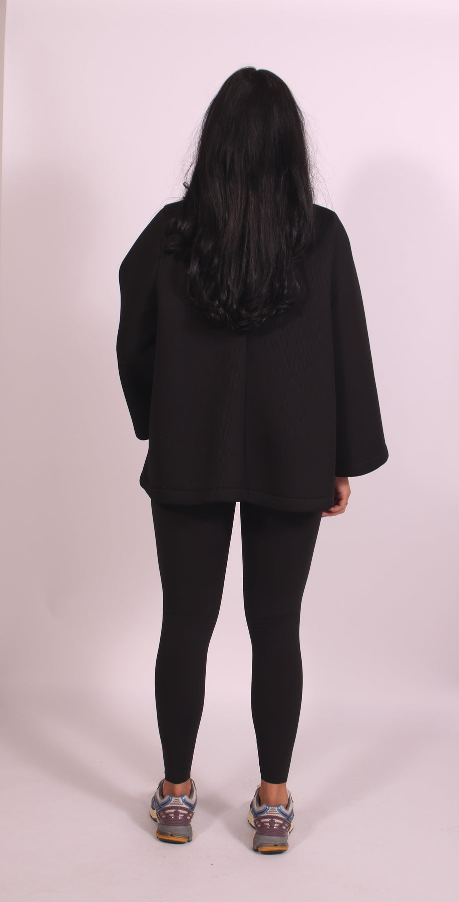 Het model is 1,65 lang en draagt de Button jacket in maat one size.